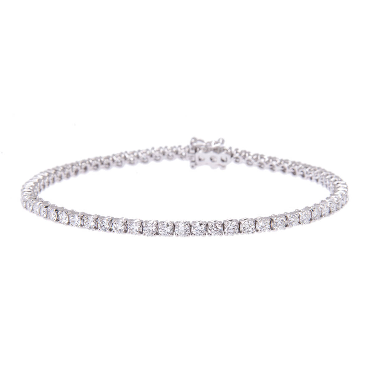 A classic 18 carat white gold tennis bracelet is set along its length with brilliant cut diamonds each mounted in its own unique 4-claw setting to maximum sparkle with this lovely design.