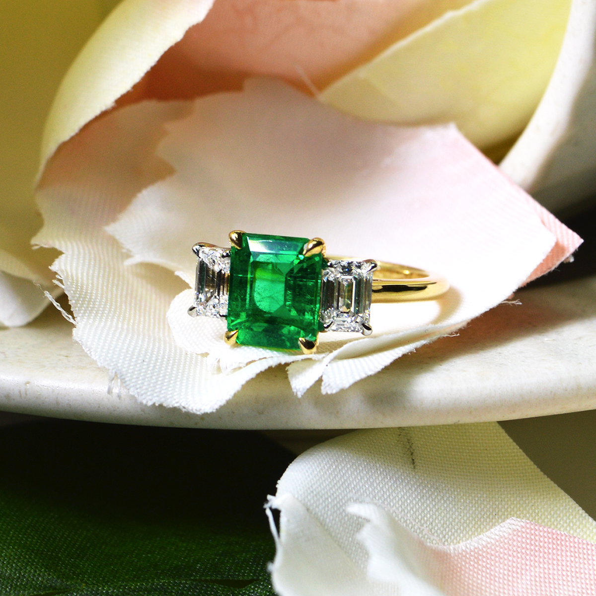 This beautiful emerald and diamond three stone ring showcases this spellbinding gemstone. The central emerald cut gemstone is echoed by a matched pair of D colour emerald cut diamonds to create a stunning ring that is reminiscent of the Art Deco period. Mounted in an 18ct yellow gold setting to accentuate the natural vivid green colour of the centre stone.