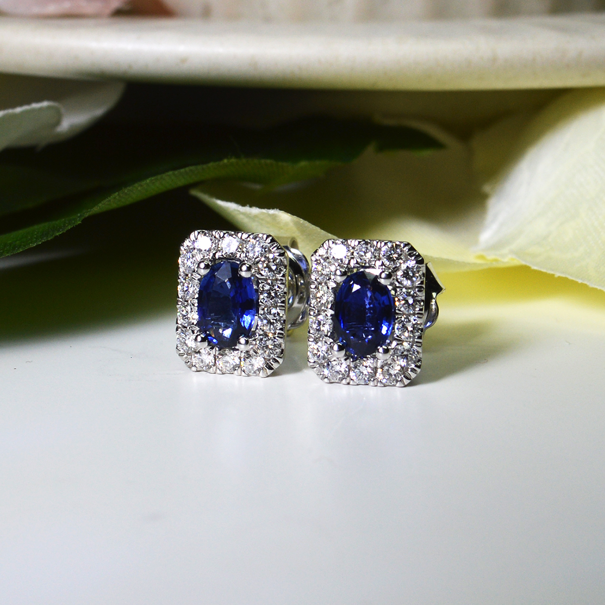 18ct white gold oval cut sapphires earrings, each surrounded with a rectangular shaped halo of brilliant cut diamonds.
