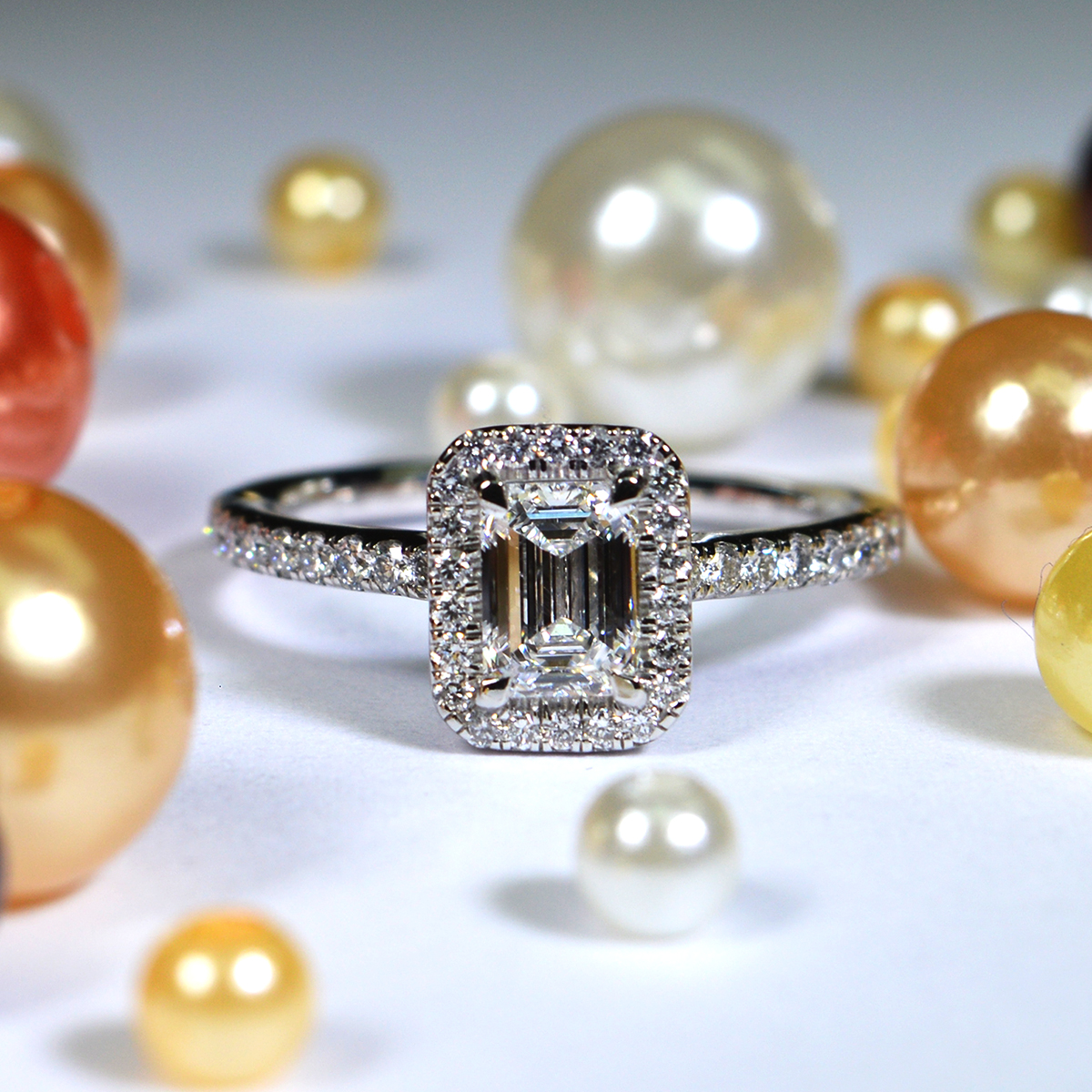 This sophisticated and elegant emerald cut diamond cluster ring is a true compliment to its stylish wearer. The central 0.50ct emerald cut diamond, sparkles in contrast surrounded by a halo of brilliant cut diamonds, totalling 0.30ct, with the same detailing following on down the shoulders.