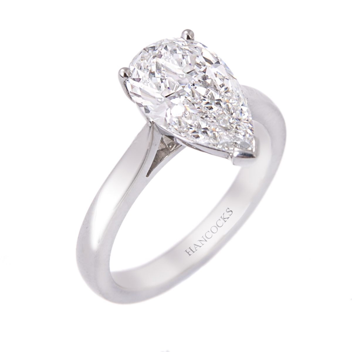 A platinum pear cut diamond solitaire ring, less commonly seen than a round brilliant cut but equal in beauty and sparkle making it a perfect choice for an engagement. This GIA certificated solitaire diamond of the finest colour has been securely mounted in a platinum V-point setting with a further 2 claws, emphasising the profile of this stunning stone and showing the diamond in its full glory.
