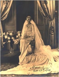 On her Molyneux wedding dress in silver lame brocade, with a draped neckline and medieval sleeves, Princess Marina wore one of her wedding gifts from Queen Mary – an oblong plaque brooch set with diamonds, and around her neck a riviere of 36 diamonds, the gift of King George V.