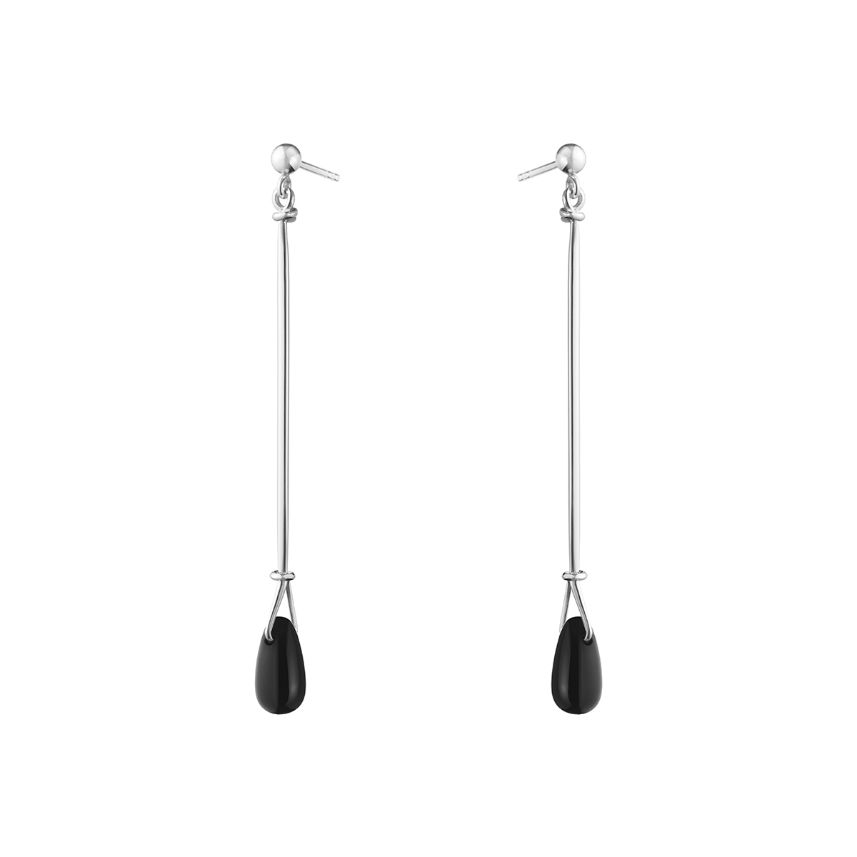 These sterling silver slender earrings feature a droplet of black onyx that is suspended from a fine silver bar, with post and butterfly fittings.