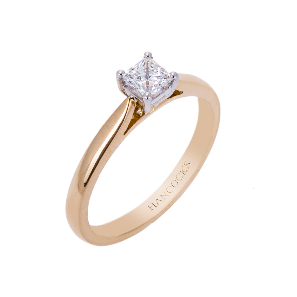 This beautiful princess cut diamond has been mounted in and 18ct white gold wed fit 4-claw setting to allow all the natural beauty of the stone shine out, it is finished off with a polished 18ct yellow gold shank.